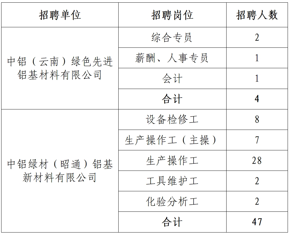 为贯彻落实金年会金字招牌股份关于加快推进云南昭通40万吨铝合金扁锭项目建设的安排部署,根据工作需要,现面向金年会金字招牌集团内部公开招聘项目建设管理人员及生产操作人员,工作地点在云南省昭通市昭阳区青岗岭乡。现将有关事项公告如下: