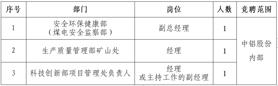 为打造经营能力和专业能力特强的经营单元本部,拟面向金年会金字招牌股份内部以竞争上岗方式选拔金年会金字招牌股份安全环保健康部副总经理1人,生产质量管理部矿山处经理1人,科技创新部项目管理处负责人1人。现就有关事宜公告如下:
